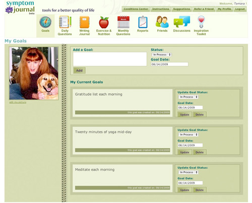 Your goals will welcome you when you log on and greet you again in your Journal Writing section. Chronic health conditions are a journey that requires patience. By making goals and affirmations a daily part of your life, they bring your goals alive to you and will assist you in maximizing your success.